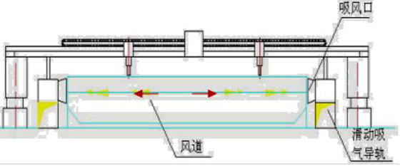在切割平臺(tái)兩側(cè)安裝方形吸風(fēng)道,吸風(fēng)道上方裝有一個(gè)可隨切割機(jī)一起移動(dòng)的滑動(dòng)吸風(fēng)小車(每個(gè)切割機(jī)兩個(gè))?;瑒?dòng)吸風(fēng)小車、切割頭、安裝在切割機(jī)沿橫梁方向的同一直線上。利用切割平臺(tái)上的格柵板與被切割鋼板形成煙氣通道,切割鋼板時(shí),產(chǎn)生的切割煙塵通過(guò)該煙氣通道由風(fēng)機(jī)負(fù)壓作用流向滑動(dòng)小車吸風(fēng)口,進(jìn)入方形吸風(fēng)道,最后進(jìn)入凈化器主機(jī)進(jìn)行切割煙塵凈化處理。