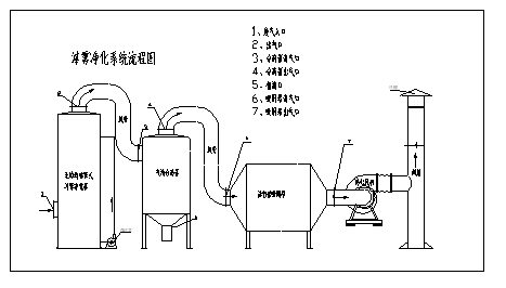 噴漆廢氣產(chǎn)生于工件涂裝的噴漆工作臺,高壓空氣噴射出的油漆大部分留在工件上,其它的隨著廢氣帶出,形成漆霧粉塵。這些粉塵含量不高,粒徑較小,絕大部分在10μm以下,塔體外部的漆霧在風機的吸力下進入本無填料噴霧式漆霧凈化塔,氣體經(jīng)塔體內的氣體分布器分布后向塔內上方行走,在行走的過程中,遇到多級噴淋洗滌的凈化液,漆霧與液體進行完全飽和接觸,顆粒狀塵霧被水帶走進入貯液槽,并由水泵抽走,余下的干凈尾氣通過網(wǎng)狀過濾器過濾后,再進入下一組多級噴淋洗滌工序,經(jīng)再次多級噴淋洗滌處理,和網(wǎng)狀超細過濾器過濾后余下的空氣排出。